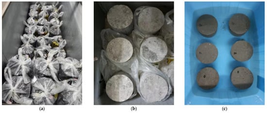 According to the standard (JTGE51-2009), the FT test was launched on 7 groups of mixtures (2–0–0, 2–0, 2–30, 2–60, 2–90, 3–60, and 4–60), in which the aggregate in specimen 2–0–0 was only RCS. Each mixture set should prepare 18 Φ150 mm × 150 mm standard cylinder specimens, of which 9 were freeze–thaw specimens, and 9 were parallel specimens to measure the UCS of pre-freeze–thaw specimens. Firstly, the freeze–thaw specimens that were cured for 28 days (after 27 days of curing, the specimens were immersed in water for 1 day, and the water surface was 2.5 cm higher than the top surface of the specimen) were settled in a −18 °C low-temperature chamber (Rated power 320 W, 728, Qingdao Tao Qiang trading company, Qingdao, China) and maintained at a constant temperature for 16 h. In addition, we should guarantee that each test block can contact the same freeze–thaw environment. When the 20 mm pores were kept between the test blocks, the full circulation of cold air was ensured. Otherwise, each test block will produce different frost heave forces due to contacting with different environments, which will lead to different pore expansion degrees and inconsistent damage forms, resulting in a large of errors in the test results and becoming an invalid test. Then, the specimens were placed in a 20 °C tank and maintained at an invariant temperature for 8 h. Finally, the specimens were removed and put on a horizontal dry desktop. After standing for 15 min, the specimens were weighed and their average value was taken: a complete freeze–thaw process. The UCS and mass of the specimens were recorded after 0, 5, 10, 15, 20, 25, 30, 35, and 40 freeze–thaw cycles. At the same time, the freeze-resistance of the mixtures was evaluated comprehensively from the appearance, mass, and UCS damage changes, respectively. The damage amount of UCS is calculated according to Formulas (1) and (2), and the FT test is manifested in Figure 8.