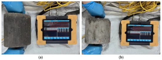 Ultrasonic test: (a) ultrasonic test in the UCS test and (b) ultrasonic test in the FT test.