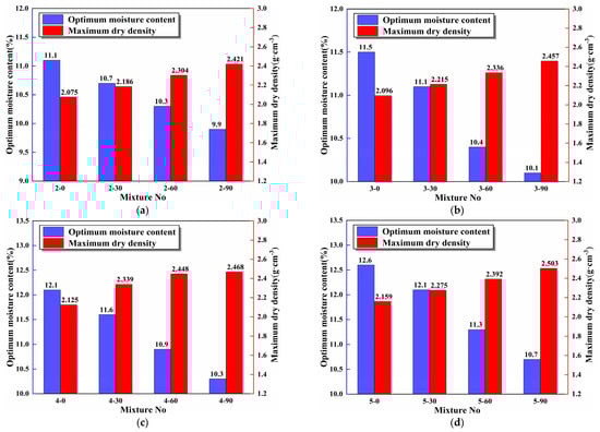 Test results of MDD and OMC of the mixtures of different cement contents: (a) 2% cement content, (b) 3% cement content, (c) 4% cement content, (d) 5% cement content.