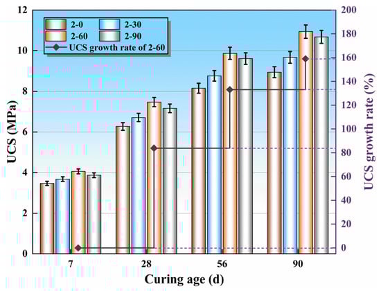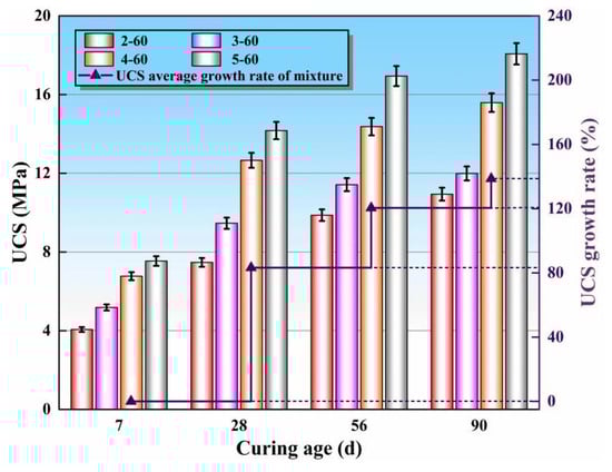 Based on the superior SS replacement rate of 60%, the UCS development laws of mixtures with different cement contents (2%, 3%, 4%, and 5%) at 7, 28, 56, and 90 days were explored, as shown in Figure 12. It can be observed that the UCS of the mixtures rose with the increase in cement content and curing age. At 7 days, the UCS of specimens 3–60 and 4–60 were significantly higher than specimen 2–60, which increased by 1.12 MPa and 1.59 MPa, respectively. This is because with the addition of cement content, the proportion of CaO in the mixture increased, and more Ca(OH)2 was generated, which stimulated the early-aged hydration reaction of the mixture. When the cement content was 5%, the proportion of CaO in the mixture continued to increase, but the UCS of specimen 5–60 was a mere 0.77 MPa higher than specimen 4–60. This occurred because excessive cement content inhibited the secondary hydration of active substances such as Al2O3 and SiO2. Therefore, when the mixture has higher early strength requirements in engineering applications, measures such as optimizing the aggregate gradation and optimize construction technology should be seriously considered. The average UCS growth rate of specimens with different cement content reached 85.4% at 28 days, mainly depending on the micro-aggregate effect and secondary hydration reaction. At 56 days and 90 days, the average growth rate of UCS of the specimens decreased significantly, which was caused by the slow reaction rate in the later stage due to the completion of hydration of the mixed liquid in the earlier stage.