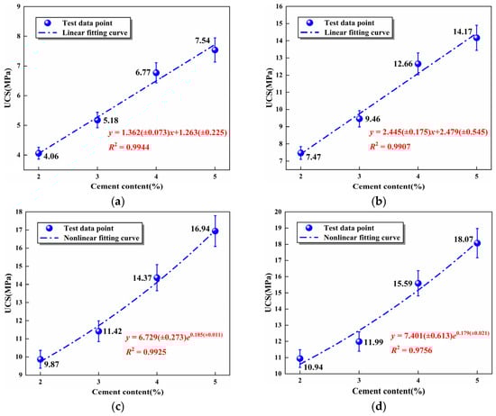 The relationship between UCS and cement content of the specimens at different curing ages: (a) 7 days, (b) 28 days, (c) 56 days, (d) 90 days.