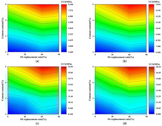 The UCS of the mixtures with various cement contents and SS replacement rates at different curing ages: (a) 7 days, (b) 28 days, (c) 56 days, (d) 90 days.