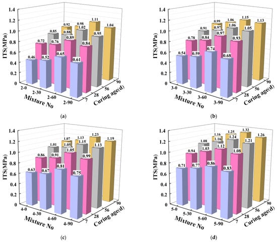The ITS of the mixtures with various cement contents: (a) 2% cement content, (b) 3% cement content, (c) 4% cement content, (d) 5% cement content.