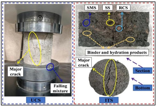 Figure 16 describes the fracture patterns of the specimens in UCS and ITS tests and shows that the fracture patterns of both are distinct. In the UCS test, cracks first occurred in the ITZ and gradually expanded to the binder. In the process of pressurization, tiny cracks appeared in the specimen and accumulated continuously, and the width became larger and then several penetrating prominent cracks were formed, finally leading to the failure of the specimen. In the ITS test, the cracks extended up and down both sides after forming in the ITZ and deflected when crossing to the relatively weak side of the strength. Eventually, the failure occurred when a penetrating main crack was generated on the bottom surface of the specimen. In addition, the evenly distributed SS, SMS, RCS, cement, and FA binder and the hydration products in the mixture can be explicitly observed from the ITS section failure diagram.