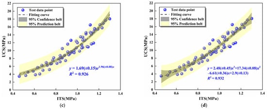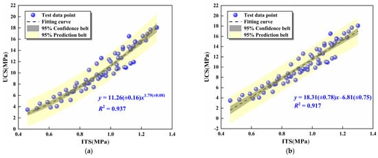 According to the UCS and ITS test results, there was a positive correlation between the UCS and ITS of the mixtures. Based on this, the relationship between UCS and ITS of mixtures was qualitatively analyzed by power, linear, exponential, and polynomial functions. The results are concluded in Figure 17. It can be summarized that the correlation coefficients of the four fitting models were higher than 0.915, which could accurately reflect the relationship between UCS and ITS of the mixtures. Therefore, when the ITS of the mixtures was not easily accessible, the mathematical model of the power function between the UCS and ITS can be applied to estimating the ITS of the mixture.