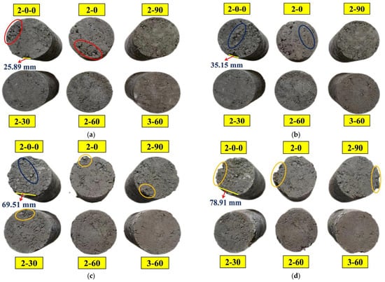 Appearance of the mixtures with various freeze–thaw cycles: (a) 0 cycles, (b) 10 cycles, (c) 20 cycles, (d) 40 cycles.