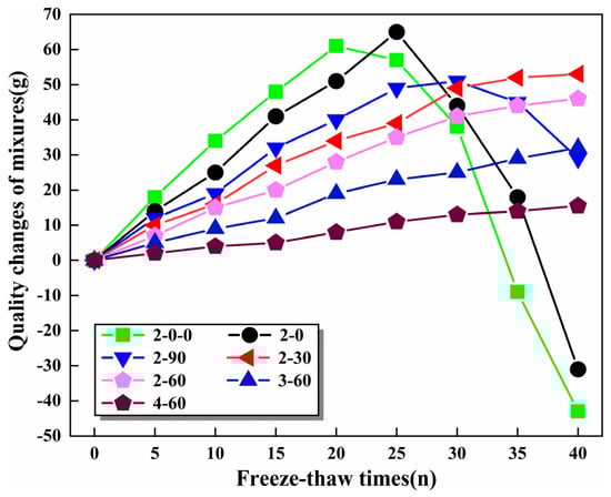 Figure 19 summarizes the quality of the specimens under different freeze–thaw cycles. It could be seen that the quality of all samples showed an increasing trend before 20 freeze–thawing cycles. During the freezing process, the water in the specimen turned into ice at low temperatures, and cracks appeared inside the specimen. During the melting process, the ice in the specimen melts into water at high temperatures, but the cracks formed by the last frost heave are still there, providing more room for the next frost heave. After multiple freeze–thaw cycles, the cracks accumulated, and the width became larger, resulting in severe water immersion. The quality peaks of specimens 2–0–0 and 2–0 appeared at 20 and 25 freeze–thaw cycles, respectively. This was because the incorporation of SMS stimulated the hydration reaction of the specimen, increasing its frost resistance. Different from specimens 2–0–0 and 2–0, the quality peak of specimen 2–90 appeared at 30 freeze–thaw cycles, and the quality decreased slowly after 30 freeze–thaw cycles. In addition, the quality after 40 freeze–thaw cycles was still more significant than before freezing and thawing. The reason was the micro-expansion effect of the SS was increased in the freeze–thaw process, causing the mixture to tighten gradually and the surface binder to fall off. However, the hydration of active substances such as C2S and C3S in SS enhanced the freezing resistance of the mixture, which explained why the quality of 2–90 was still higher than that before freezing and thawing after 40 cycles of freezing and thawing. At the same time, because the micro-expansion effect of SS in specimens 2–30 and 2–60 was not noticeable, the quality of the specimens exhibited a slow upward trend during the whole FT test. In addition, the mass growth rate of specimens 2–60, 3–60, and 4–60 decreased successively, indicating that the addition of cement strengthened the freezing resistance of specimens. The reason was that CaO, as the main component of cement, could produce more C-S-H and other gelling products in the hydration reaction, which filled the pores of the mixture and hindered the formation of cracks in the mixture.