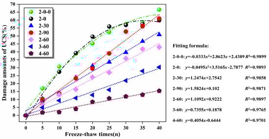 Figure 20 summarizes the UCS damage amount of the specimens with the rise of freeze–thaw cycles. The mathematical models of the freeze–thaw cycles and UCS damage were acquired by linear regression analysis. The correlation coefficients R2 were greater than 0.97, illustrating that the freeze–thaw cycles of the specimen were in superior agreement with the UCS damage. It could be seen that when the freeze–thaw cycles continued to extend, the UCS damage gradually increased. After 40 freeze–thaw cycles, the UCS damage of specimens 2–0–0 and 2–0 were 66.6% and 60.9%, respectively, which were significantly greater than specimen 4–60 (15.4%), demonstrating that SS and SMS can dramatically alleviate the UCS damage of specimens. In addition, the fitting curves of UCS damage and freeze–thaw cycles of specimens 2–0–0 and 2–0 were the quadratic parabola, and the rest of specimens containing SS manifested the linear correlation. The principal reason is that the water absorption rate of RCS is greater than SS. Before 30 freeze–thaws, the cracks inside the mixture continued to expand, causing more free water to flow in and promoting greater frost heave forces. Therefore, the UCS damage of the early stage of the specimen ascended rapidly. After 30 freeze–thaw cycles, the internal porosity of the mixture decreased, resulting in the weakening of the active cooling pore water function of RCS, which made the UCS of the specimen exhibit a slow upward trend. Compared with specimen 2–0–0, the initial UCS damage of specimen 2–0 was less because active minerals such as C2S and C3S in SMS stimulated the hydration reaction more, thus enhancing the frost resistance of the specimen. At 8 freeze–thaw cycles, the fitting curves of UCS damage and freeze–thaw cycles of specimens 2–30 and 2–90 were crossed. This occurred because specimen 2–90 contained more SS. With the continuous extension of the freeze–thaw cycle, the decrease in compactness led to a higher rise in UCS damage than specimen 2–30. With the increase in cement content, the slope of the fitting curve of specimens 2–60, 3–60, and 4–60 decreased in turn. The reason was that the cementitious yield increased with the rise of cement content, which optimized the pore structure of ITZ and stimulate the mixture density.
