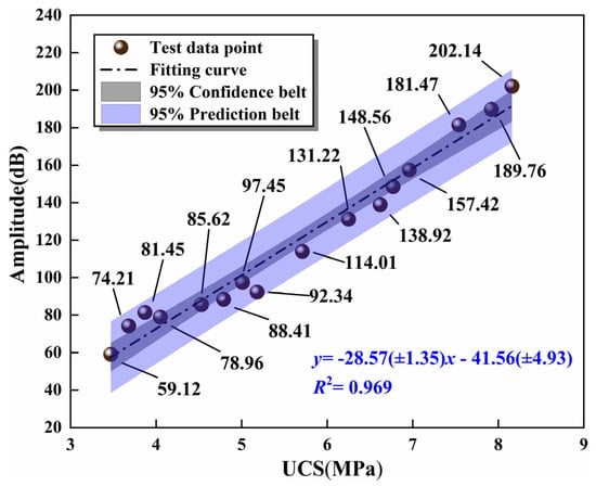 According to the characteristic of forming refraction and reflection of ultrasonic waves in different ITZ, the mechanical strength inside the mixture can be analyzed. Li et al. [,] demonstrated that the ultrasonic amplitude was positively correlated with the UCS of the specimen, so the specimen at 7 days was measured by ultrasonic. At the same time, the measured sound wave was converted into a spectrogram [] by the fast Fourier transform, and the amplitude value was recorded from the spectrogram. Then, the average amplitude of each specimen was calculated to investigate the linear regression model between UCS and the ultrasonic amplitude of the specimen, as shown in Figure 21.
