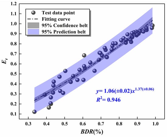 Figure 22 indicates that the Er is positively correlated with the BDR of the specimen, and the relationship between both presents the power function. The correlation coefficient R2 was 0.946, which proved that the fitting results were in precise agreement with the experimental values. Therefore, ultrasonic testing technology can detect the UCS damage of the specimen, and the power function can be used to calculate the BDR of the mixture.
