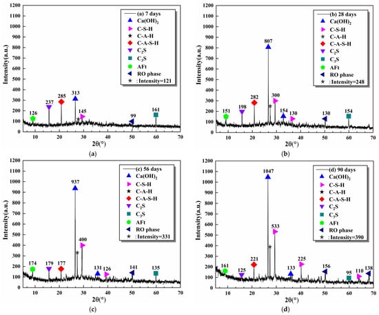 There was not much distinct in the peak value of RO phase because the RO phase was dominated by solid solution and had low activity, which mainly supplied the deposition platform for hydration products. Compared with the specimen of 28 days, the rise of Ca(OH)2 characteristic peak values at 56 days and 90 days was smaller. This is mainly attributed to two aspects. On the one hand, SS provided a sufficient Si source for the reaction system to react with Ca(OH)2 to form C-S-H gel. On the other hand, the strong alkalinity of Ca(OH)2 stimulated the secondary hydration of SS, SMS, and FA, which consumed a large amount of Ca(OH)2.