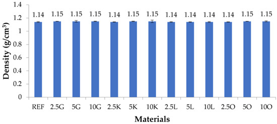 The density values are presented in Figure 4 and Table 6. The density of the sample without filler was 1.14 g/cm3. The density of grapefruit filler samples was 1.15 g/cm3 for all filler contents. The same was valid for lemon. Regardless of the filler content in the model, the density was 1.14 g/cm3. For models with lime and orange fillers, the density of the samples containing 2.5 wt.% filler was 1.14 g/cm3, the same as the REF material. For both groups of composite materials, the samples with 5 and 10 wt.% filler contents had a density of 1.15 g/cm3. These values were 1.14 and 1.15 g/cm3, which are very similar (a difference of approx. 0.9%) and should be treated as the same.