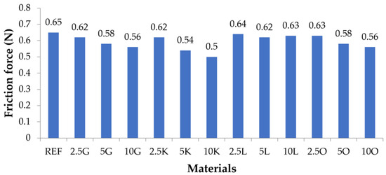 The friction force values are presented in Figure 6 and Table 8. The friction force value of the reference material was 0.65 N, the highest friction force value of all tested materials. Convergence was noticed for composite materials containing grapefruit, lime, and orange in the matrix. For all composite materials, the friction force value decreased upon increasing the filler content in the matrix. The exception to this was composited with lemon filler. The friction force values for the materials were similar, and it should be considered that the friction force values for all lemon-containing materials, regardless of the filler content, were equal (2.5L: 0.64 N, 5L: 0.62 N, and 10L: 0.63 N). The lowest friction force value was recorded for the 10K material (0.5 N), which was 23% lower than the reference sample.