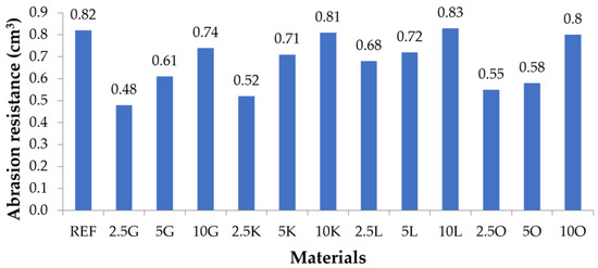 The results of the abrasion resistance tests are presented in Figure 7 and Table 9. The highest value of abrasive wear was observed for the REF sample (0.82 cm3) and for composite materials with 10% filler (10G: 0.74 cm3, 10K: 0.81 cm3, 10L: 0.83 cm3, and 10O: 0.8 cm3). These values should be considered equal in the case of REF, 10K, 10L, and 10O. All composite materials’ abrasion resistance decreased upon increasing filler content. The lowest values of abrasive wear were observed for materials with the lowest filler contents (2.5G: 0.48 cm3, 2.5K: 0.52 cm3, 2.5L: 0.68 cm3, and 2.5O: 0.55 cm3). The lowest consumption values were recorded for the 2.5G composite. Comparable abrasive wear was observed for 2.5K and 2.5O materials. The lowest abrasive wear value of 0.48 cm3 was over 41% lower than the abrasive wear of the REF sample. Figure A2 shows photos of samples before and after the abrasive wear test using the Schopper–Schlobach apparatus.