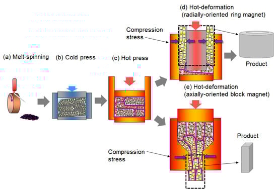 Initially, disk-shaped die-upsetting magnets were only fabricated for basic research purposes. In 1988, Kojima et al. reported the first ring-shaped hot-deformed magnet designed to be mounted on motors []. They used backward extrusion to fabricate the ring-shaped magnet and forward extrusion to fabricate the column-shaped magnet. They found that the ring-shaped magnet fabricated via backward extrusion exhibited a strong radial orientation. Yoshida et al. conducted further investigations on compression stress and grain alignment during the hot-deformation process []. They fabricated four different types of hot-deformed magnets (disk-shaped die-upsetting magnet, forward-extruded ring-shaped magnet, backward-extruded ring-shaped magnet, and forward-extruded column-shaped magnet) with a wide range of compression ratios. Their basic research also showed that the radially oriented ring-shaped hot-deformed magnet, which is suitable as a motor material, can be produced via backward extrusion.