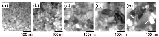 TEM images of rapidly quenched ribbons annealed at 750 °C for (a) 0 min (as quenched), (b) 1 min, (c) 3 min, (d) 5 min, and (e) 10 min (platelet grains are indicated by arrows) [].