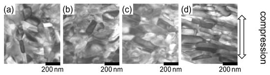 TEM images of die-upset magnets (perpendicular to the compression force direction) with a compression ratio, R, of (a) 0%, (b) 20%, (c) 40%, and (d) 60% [].