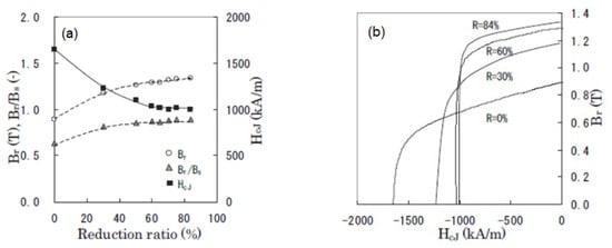 (a) Variations in the reduction ratio of magnetic properties (Br and HcJ) and alignment (Br/Bs). (b) Demagnetization curves for hot-pressed samples (reduction ratio is 0%) and die-upset samples (reduction ratios are 30, 60, and 84%). Upsetting temperature is fixed at 780 °C, and strain rate is 3.33 × 10−2 s−1 [].