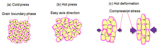 Schematic models of change in microstructure for (a) cold-pressed body, (b) hot-pressed body, and (c) hot-deformed magnet.