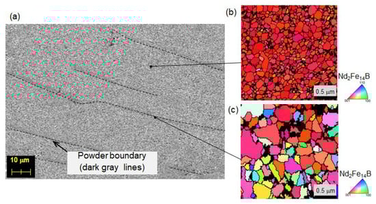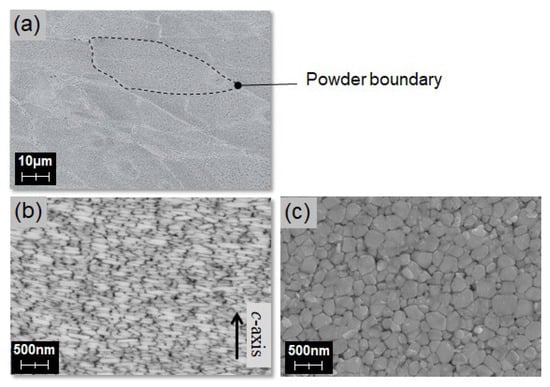 The SEM images of a typical hot-deformed magnet are shown in Figure 9a,b [], and Figure 9c. The observation planes were mirror polished, followed by etching. The dashed line in Figure 9a shows the powder boundary of the original raw powder, which is defined from its optical microstructure images that are observed separately, whereas Figure 9b,c show the SEM images of the planes perpendicular and parallel to the c-axis, respectively. These images reveal that the hot-deformed magnet has a structure in which flat grains are stacked in the c-axis direction. The grains are about one order of magnitude finer than those of a typical sintered magnet, which has approximately the same critical single-domain grain size (0.3 μm) of a Nd-Fe-B magnet []. Grain size refinement was also performed for sintered magnets on a laboratory scale, reaching a diameter of 1 μm [], and on a mass production scale, reaching 3 μm. However, it is difficult to avoid oxidation when dealing with the raw material of sintered magnets, which contains single crystals that are finer than the raw powder obtained after melt spinning. Therefore, a fine microstructure remains the most significant feature of hot-deformed magnets.