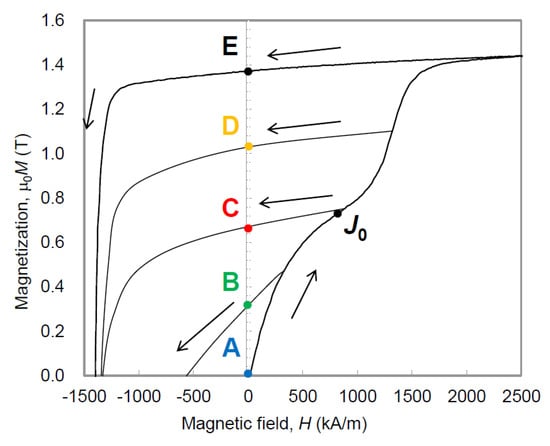 Initial magnetization and demagnetization curves for sample C. J0 is an inflection point of the initial magnetization curve. The magnetization curves indicated as B–E were measured using a pulsed high-field magnetometer with applied magnetic fields H = 279.2, 893.4, 1292, and 5991 kA/m (3.5, 11.2, 16.2, and 75.1 kOe), respectively. Point A shows the thermally demagnetized state [].