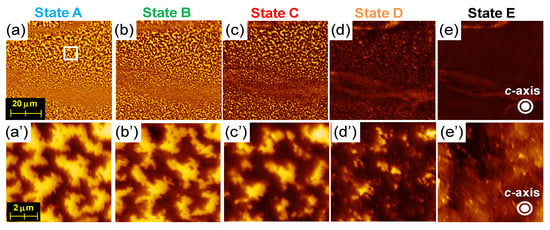 (a–e) Magnetic domain structures under H = 0 after applying the magnetic fields H = 3.5, 11.2, 16.2, and 75.1 kOe, corresponding to A–E. (a′–e′) are the enlarged figures of the area surrounded by the white square in (a). (a–e) and (a′–e′) are observed in the same areas [].
