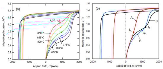 Initial magnetization and demagnetization curves for (a) sample C following deformation at 725, 750, 775, 800, 825, and 850 °C []. (b) Samples A, B, and C hot deformed at 775 °C.