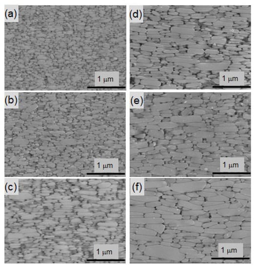 Figure 13b displays the magnetization curves for samples A–C with different Nd contents. It can be observed that the inflection points shift toward higher magnetic fields as the Nd concentration increases, which is attributed to the microstructure (grain boundary phase). Additionally, Figure 14a–f show the SEM images of sample C hot deformed at 725–850 °C, where the observation planes are parallel to the c-axis. The average grain size is defined as the diameter in the longitudinal direction of the platelet grains of such SEM images.