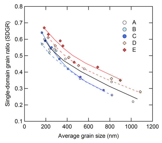 Dependence of the single-domain grain size (SDGR) on the average grain size for samples A–E. The lines are visual aids [].
