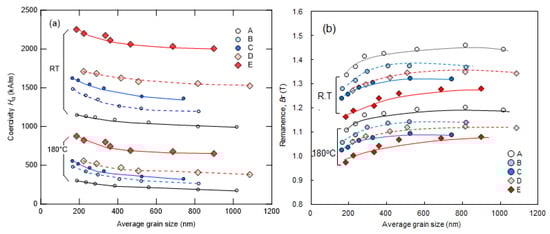Dependence of (a) coercivity [] and (b) remanence on the average grain size for samples A–E at room temperature and 180 °C. The lines provide visual guides.