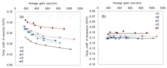 Dependence of (a) temperature coefficient of coercivity and (b) temperature coefficient of remanence on the average grain size for Samples A–E. The lines provide visual guides [].