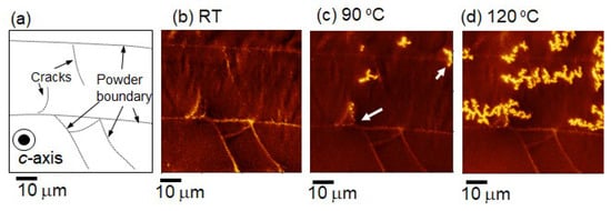 Figure 11a,b depict the same region viewed under an optical microscope and a magnetic force microscope (MFM) in the thermally demagnetized state, respectively, and the plane of observation is the c-plane. In Figure 11c, an image of the magnetic domain of area d in Figure 11b is shown, which is also observed using MFM. The white lines represent the contours of the crystal grains, which are observed separately using LV-SEM. The bright and dark shaded areas represent the two magnetic polarizations, N and S, respectively [].