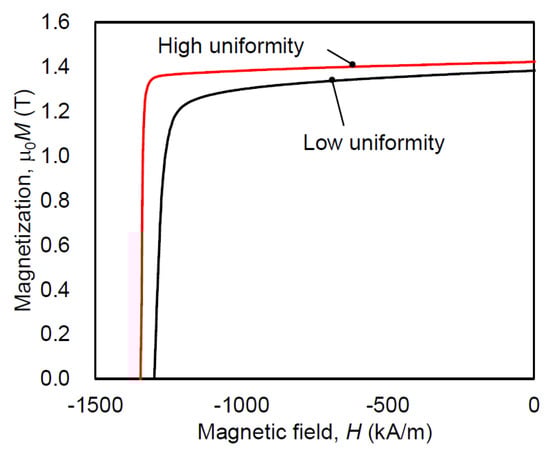 In Equation (2) [], the volume ratio of single-domain grains, SDGR, is defined based on the initial magnetization curve, where J1 is the inflection point in Figure 13 and Js is the saturation magnetization.