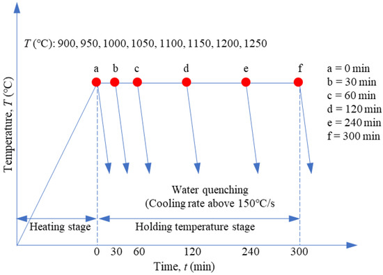 Steel alloy SA508-III with a chemical composition of 0.18% C, 0.17% Si, 1.4% Mn, 0.14% Cr, 0.51% Mo, 0.79% Ni, 0.04% Cu, 0.003% S, 0.005% P, 0.005% V, 0.022% Al, 0.013% Ti, 0.0008% Co, 0.004% As, 0.0042% Sn, and 0.0123% N (by wt.%) was investigated. The experimental data were taken from Dong et al. [1]. The cylindrical specimens (diameter: 10 mm; height: 15 mm) were heated to a specific temperature (900–1250 °C) at a heating rate of 15 °C/min and held for 0–300 min; the samples were then quenched in cold water immediately, as summarized schematically in Figure 1.
