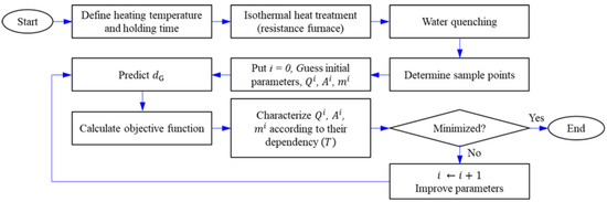 Here, dG,experiment (i) and dG,prediction (i) are the measured and predicted AGS values, respectively, and N is the number of the temperature case study at which the grain size was measured. The parameters listed in Table 2 were then acquired using a GRG optimization technique [25,26] to predict AGS growth.