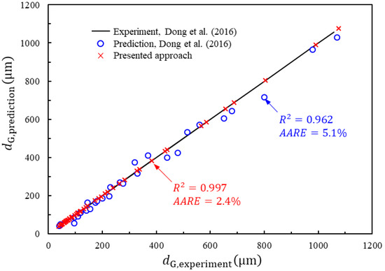 Here, is the mean value of measured AGS growth. The AARE and R2 values of when using the proposed approach (AARE = 2.4% and R2 = 0.997) are slightly lower than those found by Dong et al. (AARE = 5.1% and R2 = 0.962). Thus, although both approaches are capable of making good predictions, the superiority of our approach reflects not only high solution accuracy but also greater practicality, given that the GRG optimization technique is much simpler and more reliable. Hence, our approach for modeling AGS growth is valid.