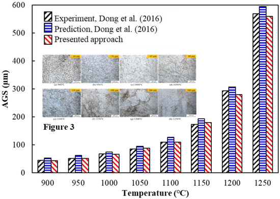 A practical case study of optimized AGS parameters was also conducted. High heating temperatures provided rapid AGS growth compared to lower temperatures. This was attributed to the growth of strain-free grains at higher temperatures, which minimized the dislocation density, showing that temperature has a greater effect on grain growth than time. Based on our results, the predicted and measured AGS values were in good agreement, with an AARE of 2.5%.