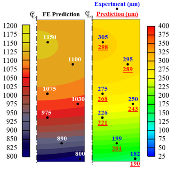 The optimized parameter characterization method described in the previous section was then applied to a practical case study with a similar specimen size and material properties. Based on the optimized parameters, the AGS prediction and its corresponding temperature were compared with the experimental results at certain sampling points, as shown in Figure 9. The AGS at the lower surface had a low growth rate as the temperature dropped faster than the core, which had a high growth rate. Upon sampling at high temperatures, the grains of austenite became coarser. The predicted AGS was 298 μm at a sample point of 1150 °C, which was about 1.5-fold larger than that at sample point 800 °C after a 30 min holding time. This was due to lower dislocation density at high temperatures, which leads to the growth of strain-free grains while, in contrast, lower temperatures have higher dislocation density [32,33]. Therefore, this phenomenon results in the unequal growth in AGS in high- and low-temperature areas [34,35,36,37]. Based on these circumstances, temperature has a greater influence on grain growth than time. In conclusion, the predicted and measured AGS values showed excellent agreement, with an AARE of 2.5%, which is sufficient for practical use.