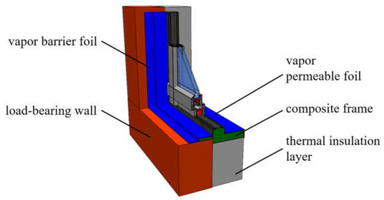 Based on the results of previous experimental and numerical studies, as well as on the literature analysis and a review of current window installation systems, the present investigations were carried out for the window installation system in the thermal insulation layer using a mounting composite frame, presented in Figure 1.