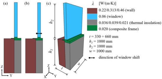 In total, calculations were made for over 400 variants of an external wall with a window installed in two positions. Dimensions, geometry, and material properties for the analysed variants are shown in Figure 2.