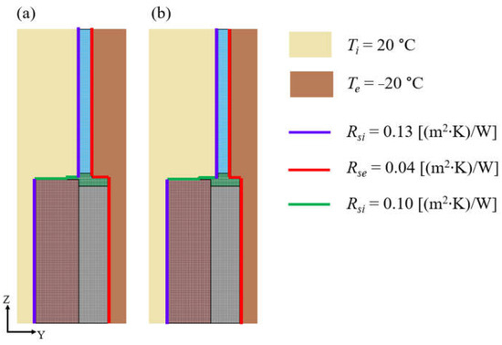 Figure 3. Numerical model and assumed boundary conditions: (a) window flush aligned with the face of the wall, (b) window shifted into the thermal insulation layer.