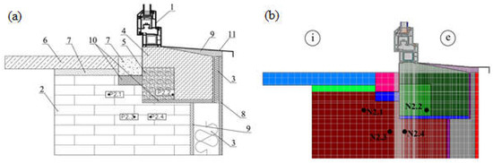 Before analysing the criteria for assessing the quality of window installation, the numerical model was verified based on a comparison of the results of numerical calculations and the results of experimental tests. The numerical model developed in the TRISCO program corresponded to the model of the actual test stand. Both the test stand (i.e., an external wall with a window installed) and the experiment were described in detail in [36]. During the measurement period lasting 28 days, the external temperature and the temperature at the selected points of the test stand were measured. The tests were conducted in autumn, winter, and spring. The arrangement of measurement points in the cross-section of the external wall is shown in Figure 4a, while the numerical model is presented in Figure 4b.