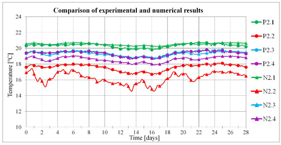 The actual temperature values turned out to be slightly higher compared to the numerically calculated values. For points P2.1 and N2.1 and for P2.3 and N2.3, the difference between the actual and numerical temperature values was on average 0.15 °C, and for points P2.4 and N2.4 was 0.7 °C. The largest temperature difference of 1.4 °C was obtained for points P2.2 and N2.2. This is due to the location of the measurement point and the numerical node in the composite mounting beam, where there is a high density of isotherms, making it difficult to read the temperature correctly. The average difference in temperature values over the entire measurement period between the experimental and numerical results was 0.7 °C.