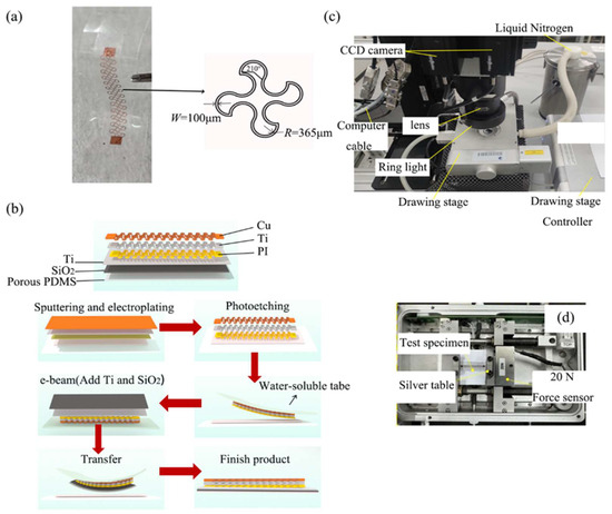 2, and a metal interconnect layer composed of Cu, Ti, and polyimide (PI). The fabrication process consists of several crucial steps, encompassing substrate preparation, sputtering, electroplating, photoetching, and transfer [