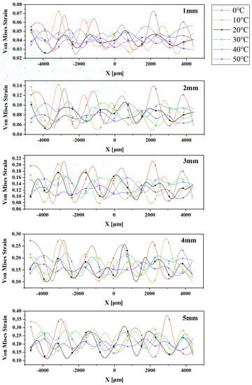 L as the horizontal coordinate. The fluctuation amplitude of the curve effectively characterizes the degree of strain mismatch for the Von Mises strain. The results demonstrate that the fluctuation amplitude of the Von Mises strain values decreases with increasing temperature for each tensile distance between 1 mm and 5 mm, indicating a weakening degree of strain mismatch. These findings align with our previous preliminary analysis.