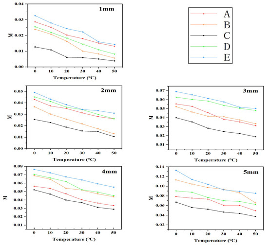 M was computed for devices A–E, stretched from 1 mm to 5 mm at temperatures ranging from 0 °C to 50 °C. The results are presented in