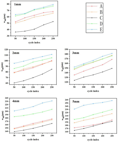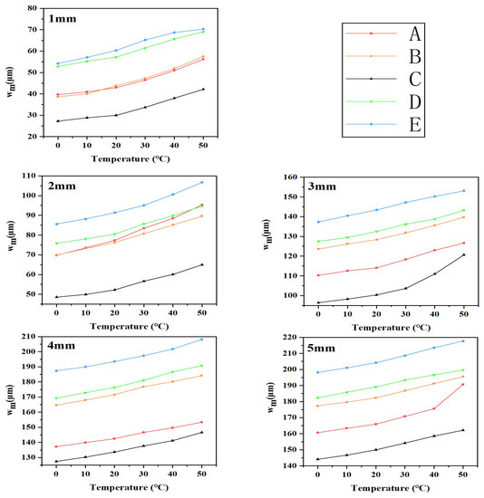 wm was calculated for the five groups of devices at temperatures ranging from 0 °C to 50 °C, stretched from 0 mm to 5 mm. The results are displayed in