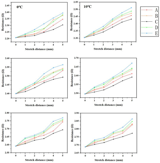 To further evaluate the behavior, we employed a DC low-resistance tester (RK2511BL) with a measuring range of 0.1 mΩ–50.0 kΩ. This allowed us to assess the resistance values of the five sets of samples subjected to different degrees of stretching (ranging from 0 to 5 mm) at six distinct temperatures: 0 °C, 10 °C, 20 °C, 30 °C, 40 °C, and 50 °C.
