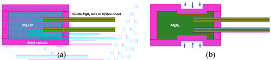 Schematic of the adopted joint architecture: (a) assembled in situ reacted MgB2 wires inside a capsule filled with pre-compressed Mg+2B mixture of the same composition used for the manufacture of the wires []; (b) junction from Figure 1a after 0.5 GPa uniaxial compression in the joining area and sintering at 900 °C for 30 min, followed by cooling, as described in the text.