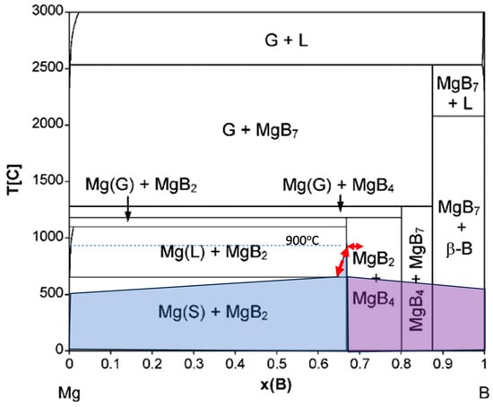 The CALPHAD method and ab initio calculations were conducted by [] to compute thermodynamic model parameters to determine the decomposition temperatures of magnesium borides and update the Mg–B binary phase diagram (see Figure 2). The planning of the sintering procedure of the “ex situ” (already in situ reacted) wires in the in situ joint capsule was based on the resulting Mg–B binary phase diagram in the present manuscript. It is important to note that based on the findings, the boundary between Mg(s) + MgB2 and Mg(g) + MgB2, as well as the MgB2 + MgB4 zone, on the elaborated phase diagram remains unchanged irrespective of the external pressure within the range 0.1–100 MPa.